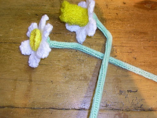 I thought if we're going to make daffodils in early May, I'd better re-familiarise myself with the pattern - these are what I've managed so far. Of course, making the trumpet for the true daffy in mohair was a big mistake; it's too dirty a yellow and too heavy for the bend in the stalk straw which means upright and unsupported it tends to droop like the odd one or two saddo flowers you always seem to get in a supermarket bunch. A lesson learned. And I should've made that one in all yellow. Obviously I should - why am I only thinking of that now? Another lesson learned. The other one - the more narcissussy one - is pretty, but I should've joined the yellow part with an overstitch rather than a bulky back seam.